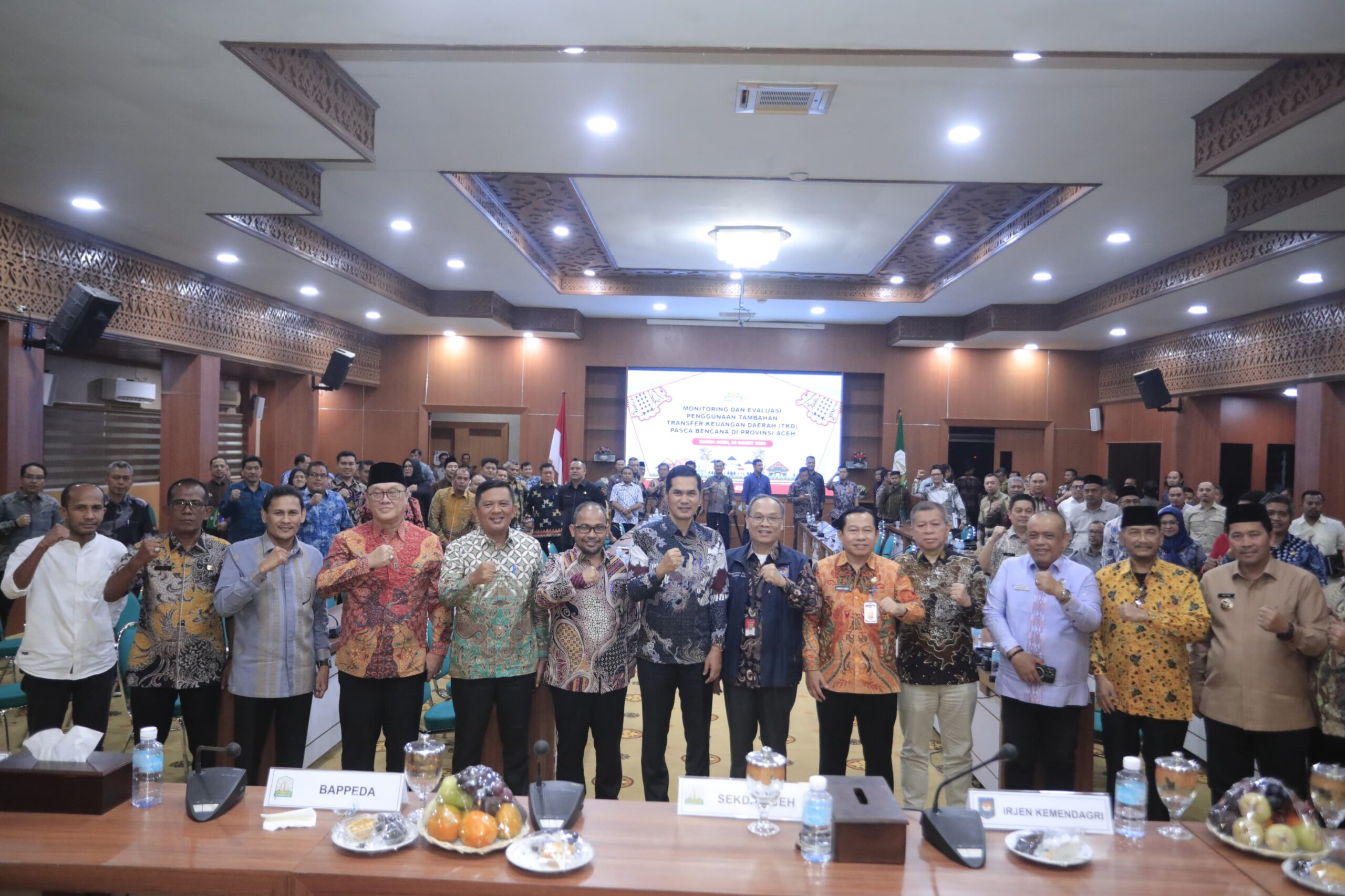 Rapat ini turut dihadiri Kepala Bappeda Aceh, Inspektur Aceh, jajaran pemerintah daerah dari sembilan kabupaten/kota terdampak, serta SKPA terkait yang terlibat dalam pengelolaan dan pengawasan TKD pascabencana.**